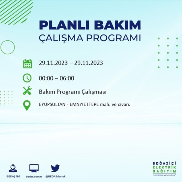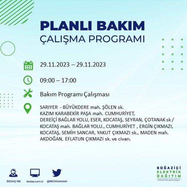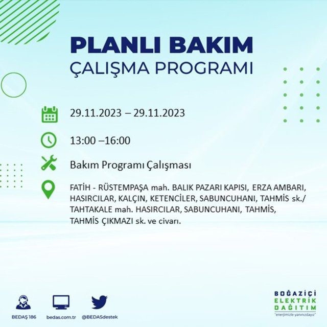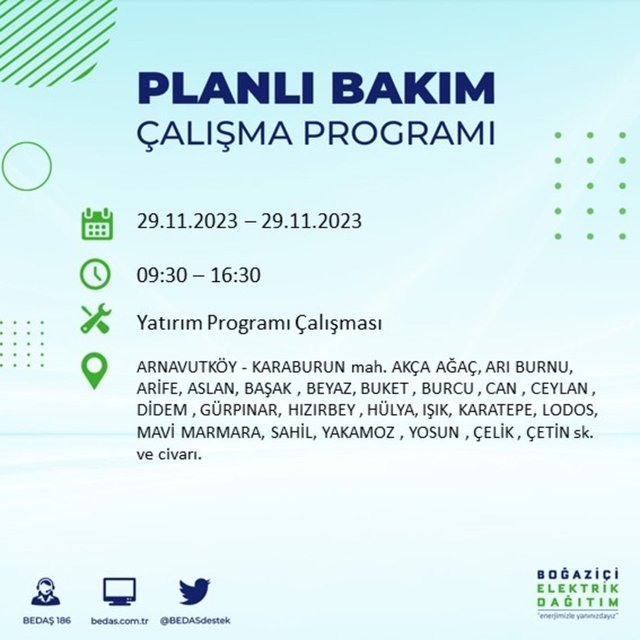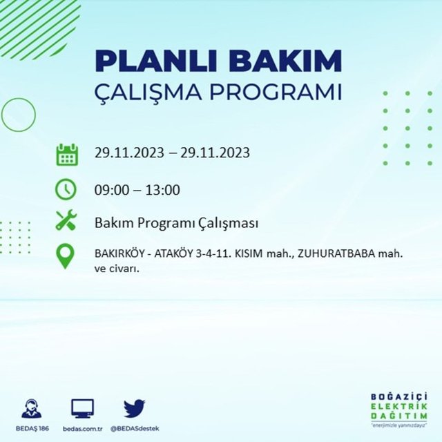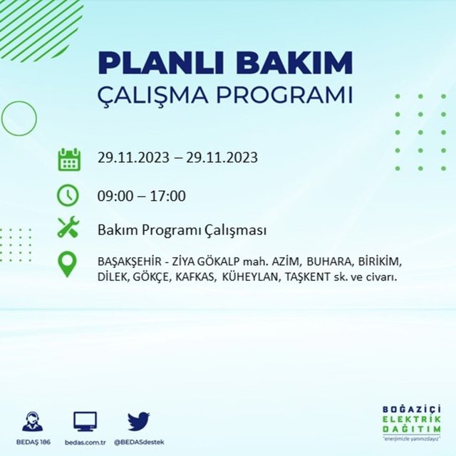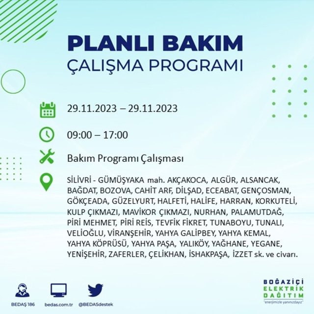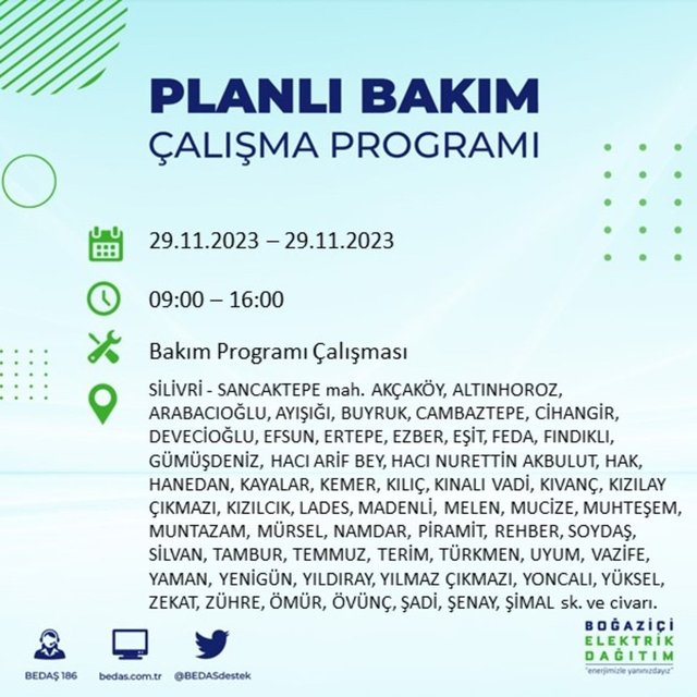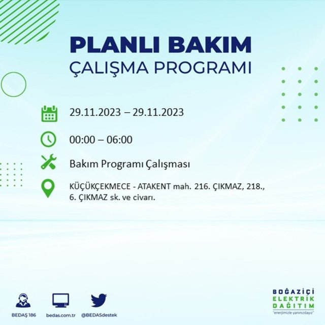 İstanbul elektrik dağıtım tedarikçi firmalarından BEDAŞ elektrik arıza duyurularını günlük olarak paylaşıyor. BEDAŞ tarafından yapılan açıklamaya göre 29 Kasım Çarşamba günü İstanbul'da 19 ilçede elektrik kesintisi yaşanacak yerler ve elektriklerin geleceği saatler açıklandı.