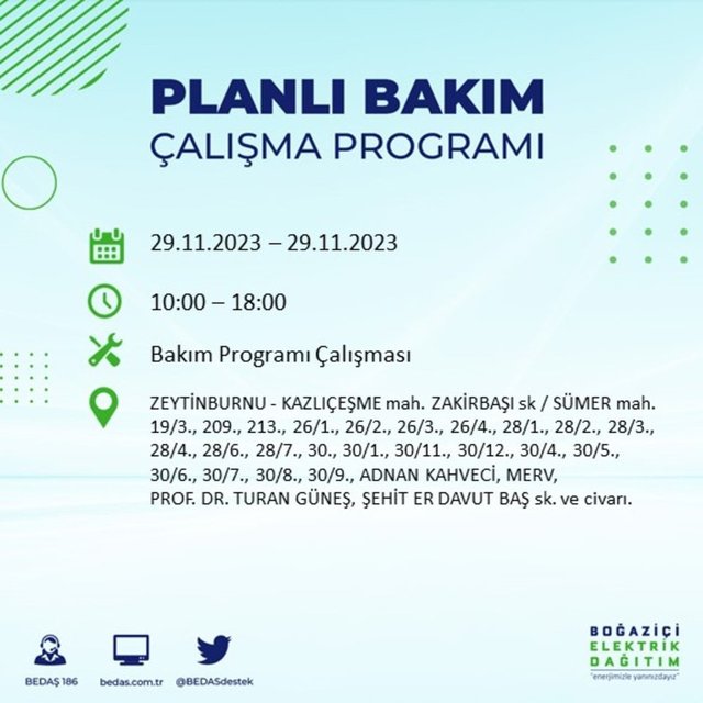 Boğaziçi Elektrik Dağıtım A.Ş tarafından yapılan açıklamaya göre, 29 Kasım Çarşamba günü İstanbul'da farklı saat aralıklarında büyük çaplı elektrik kesintileri uygulanacak. Kesintiler 19 ilçede etkili olacak.