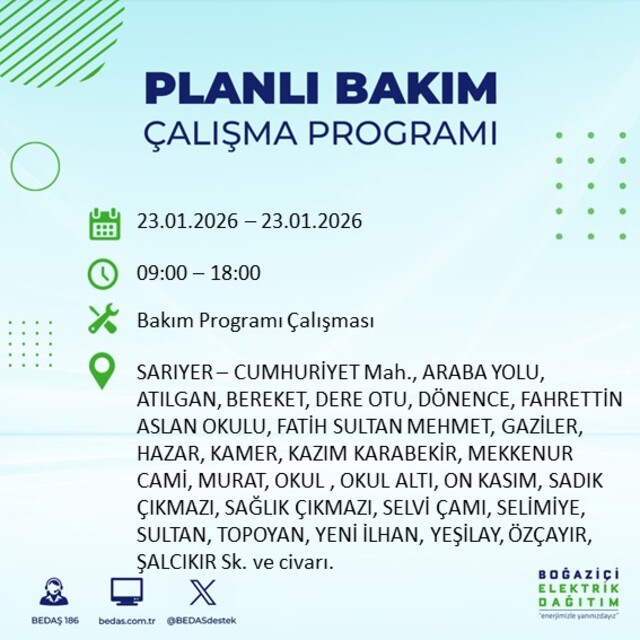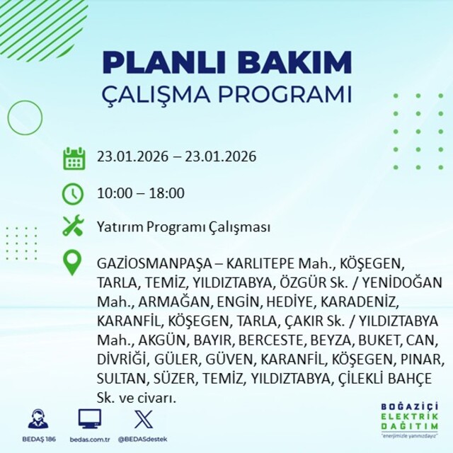 Boğaziçi Elektrik Dağıtım A.Ş tarafından yapılan açıklamaya göre, 23 Ocak 2026 Cuma günü İstanbul'da farklı saat aralıklarında büyük çaplı elektrik kesintileri uygulanacak. Kesintiler 21 ilçede etkili olacak.