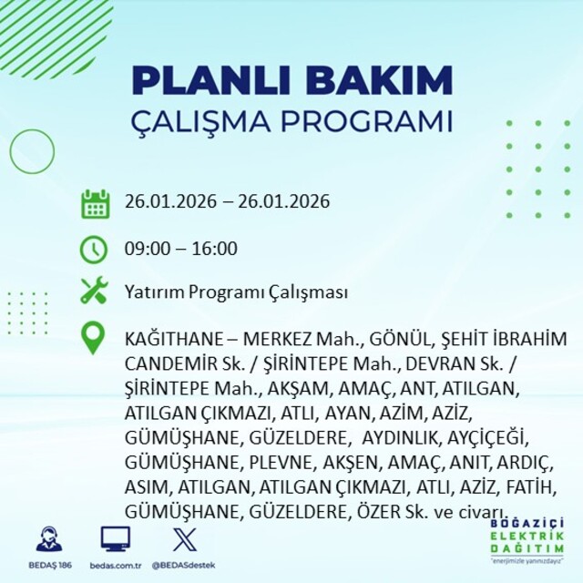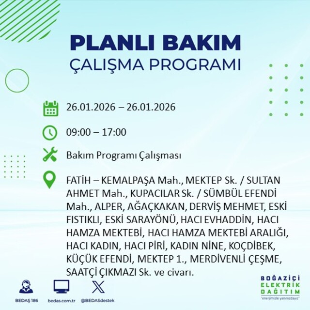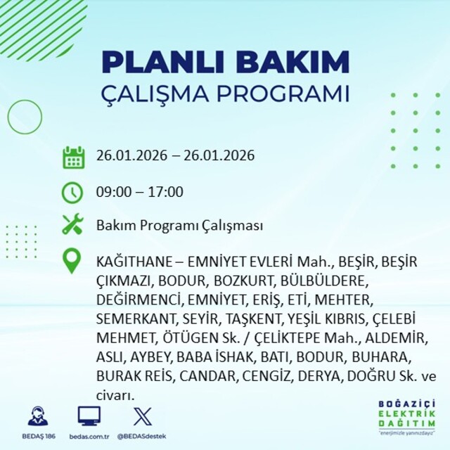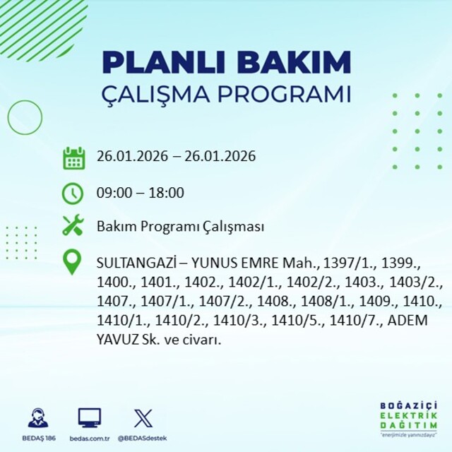 Bilindiği gibi, BEDAŞ elektrik arıza duyurularını günlük olarak paylaşıyor. BEDAŞ tarafından yapılan açıklamaya göre 26 Ocak Pazartesi günü İstanbul'da 22 ilçede elektrik kesintisi yaşanacak yerler ve elektriklerin geleceği saatler açıklandı. Peki, 26 Ocak 2026 İstanbul'da elektrik kesintisi saat kaçta başlayacak ve elektrikler ne zaman gelecek? İşte İstanbul elektrik kesintisi duyuruları...