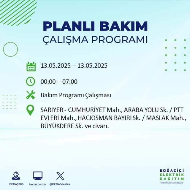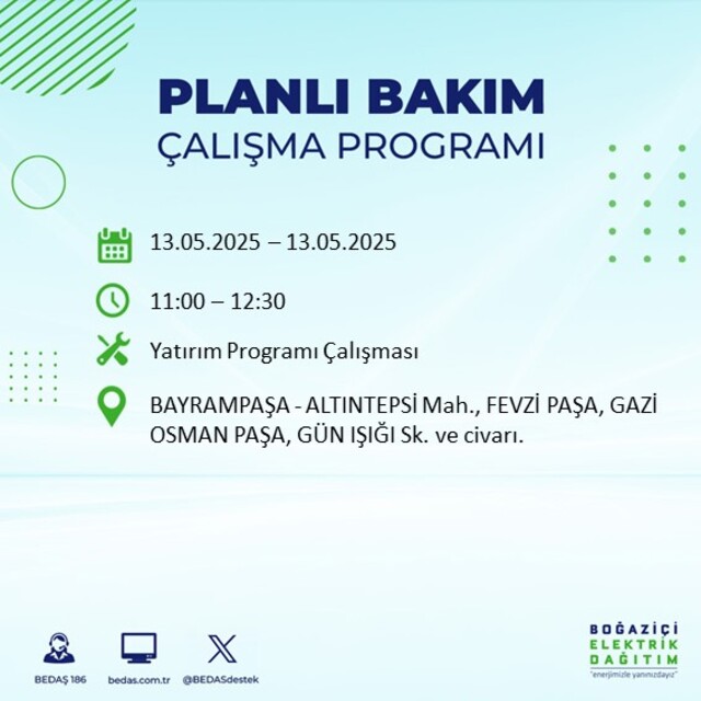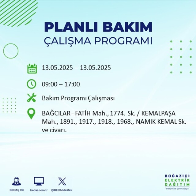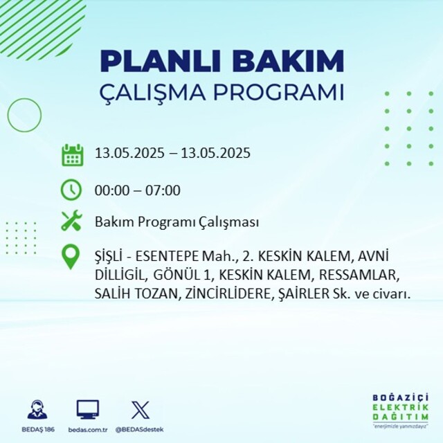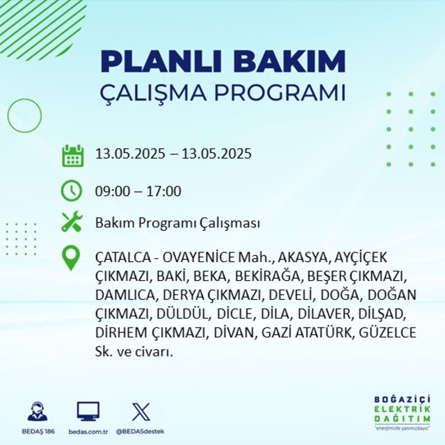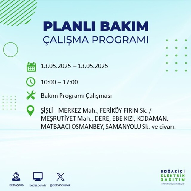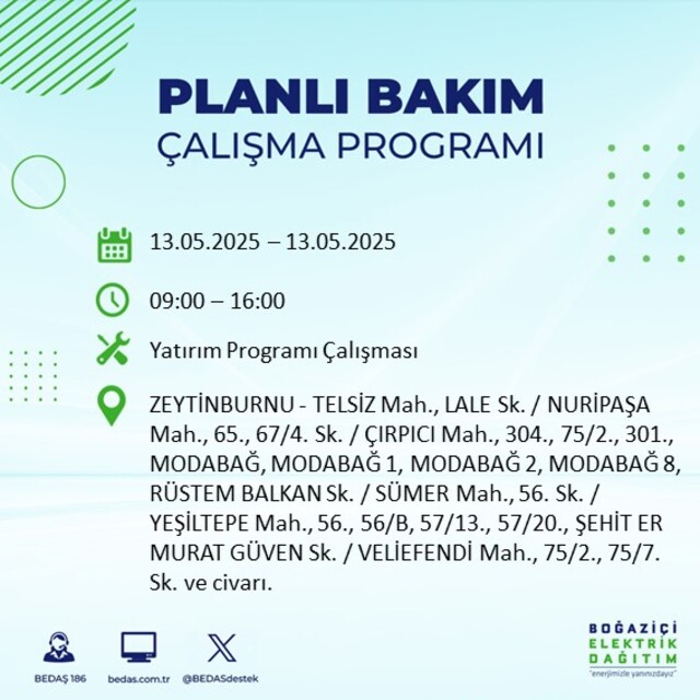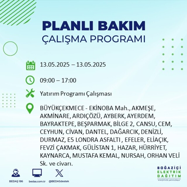 Boğaziçi Elektrik Dağıtım A.Ş tarafından yapılan duyuruya göre 13 Mayıs 2025 Salı günü İstanbul'da farklı saat aralıklarında elektrik kesintileri uygulanacak.