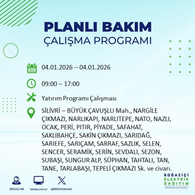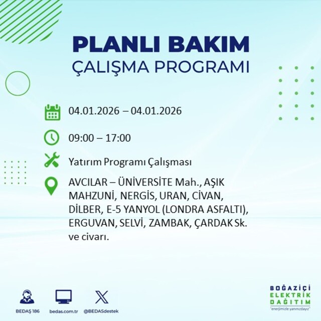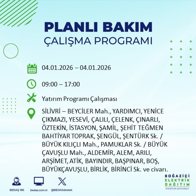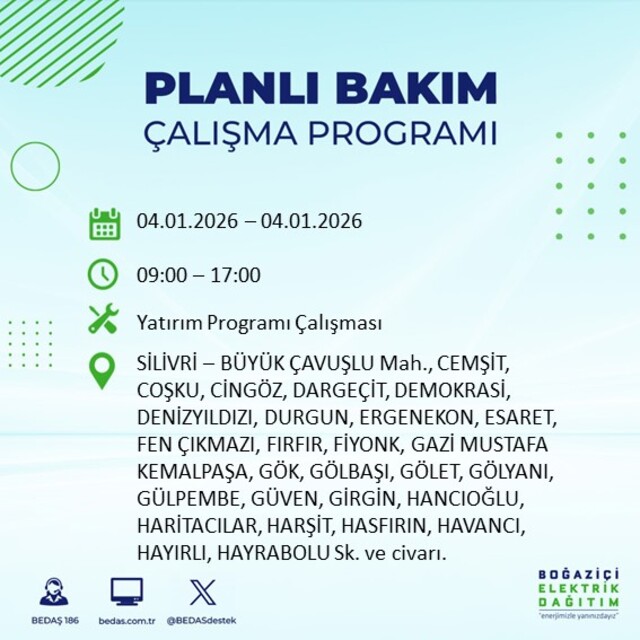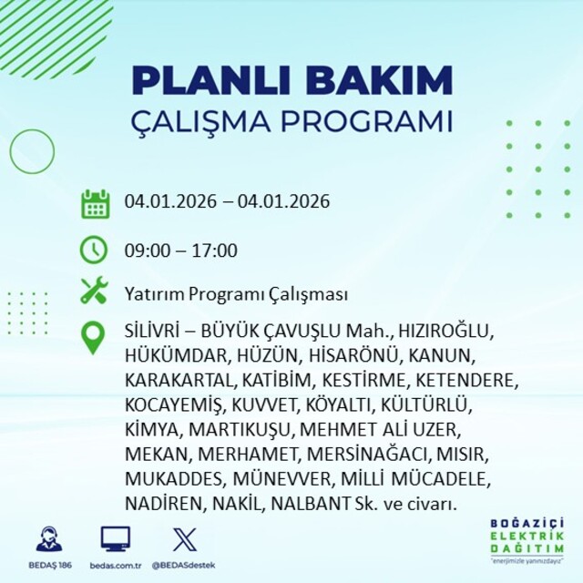 Boğaziçi Elektrik Dağıtım A.Ş tarafından yapılan duyuruya göre 4 Ocak Pazar İstanbul'da farklı saat aralıklarında 7 ilçede elektrik kesintisi uygulanacak.