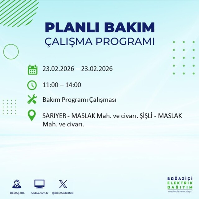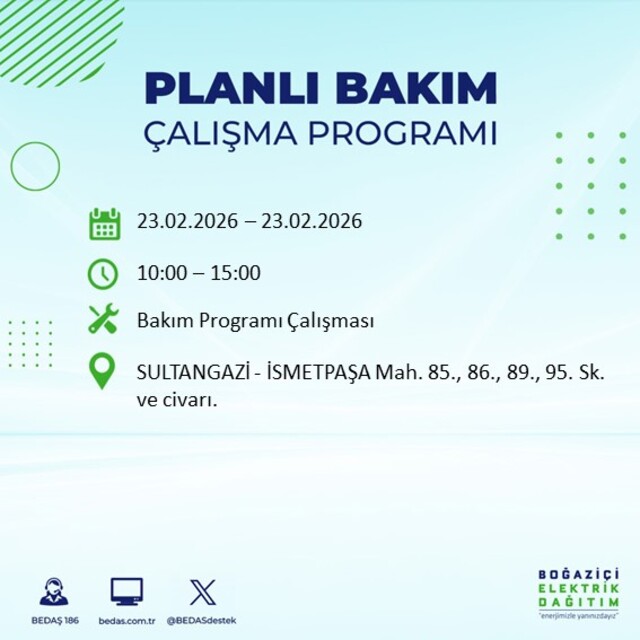 Boğaziçi Elektrik Dağıtım A.Ş (BEDAŞ) İstanbul'da 23 Şubat Pazartesi günü birçok ilçede elektrik kesintisi yaşanacağını duyurdu. Kesinti yaşanacak ilçeler ve mahalle bilgileri de paylaşıldı. Bilindiği gibi, İstanbul Avrupa Yakası elektrik kesintisi duyuruları BEDAŞ tarafından günlük olarak yayınlanıyor. İşte İstanbul'da elektrik kesintisi yaşanacak ilçeler...