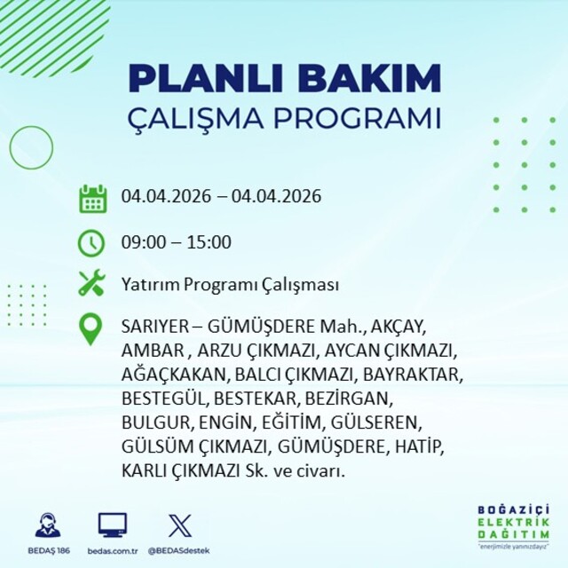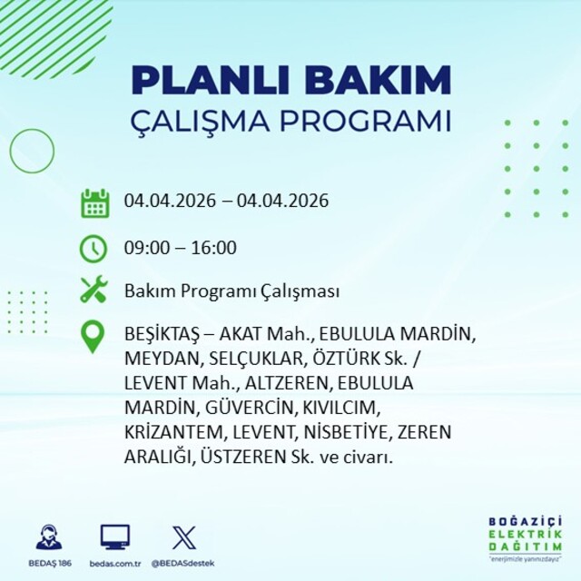 Boğaziçi Elektrik Dağıtım A.Ş (BEDAŞ) İstanbul'da 4 Nisan Cumartesi günü birçok ilçede elektrik kesintisi yaşanacağını duyurdu. Kesinti yaşanacak ilçeler ve mahalle bilgileri de paylaşıldı. Bilindiği gibi, İstanbul Avrupa Yakası elektrik kesintisi duyuruları BEDAŞ tarafından günlük olarak yayınlanıyor. İşte İstanbul'da elektrik kesintisi yaşanacak ilçeler...