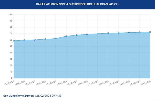 İSKİ istatistiklerine göre, 25 Şubat tarihli baraj doluluk oranları 2015'te yüzde 96,41, 2016'da yüzde 86,79, 2017'de yüzde 87,5, 2018'de yüzde 80,48, 2019'da yüzde 91,5, 2020'de yüzde 62,83, 2021'de yüzde 54,07, 2022'de yüzde 82,16, 2023'te yüzde 35,23, 2024'te yüzde 76,35 olarak kayıtlara geçti.