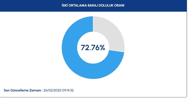 İSKİ tarafından açıklanan son veriye göre barajlardaki genel doluluk oranı 72,76 olarak açıklandı.