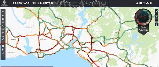 İstanbul Büyükşehir Belediyesinin CepTrafik uygulaması verilerine göre, kent genelindeki trafik yoğunluğu yüzde 90'a çıktı.
