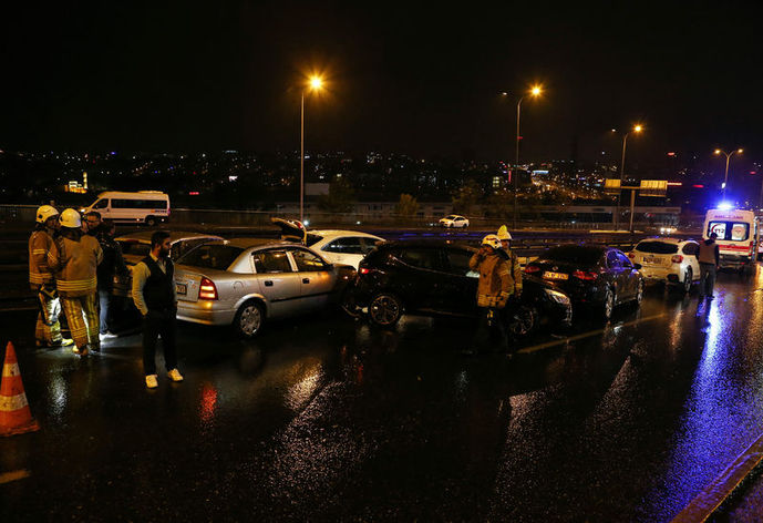 İstanbul'un Esenyurt ilçesinde bir otomobil, direksiyon hakimiyetini kaybetmesi sonucu yol kenarındaki bariyerlere çarptı. Bu araca çarpmamak için manevra yapan 9 otomobil ve bir minibüs de yağmur nedeniyle kontrollerini kaybedince birbirlerine çarptı.