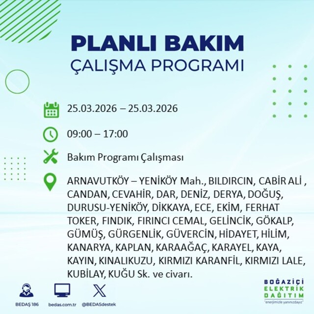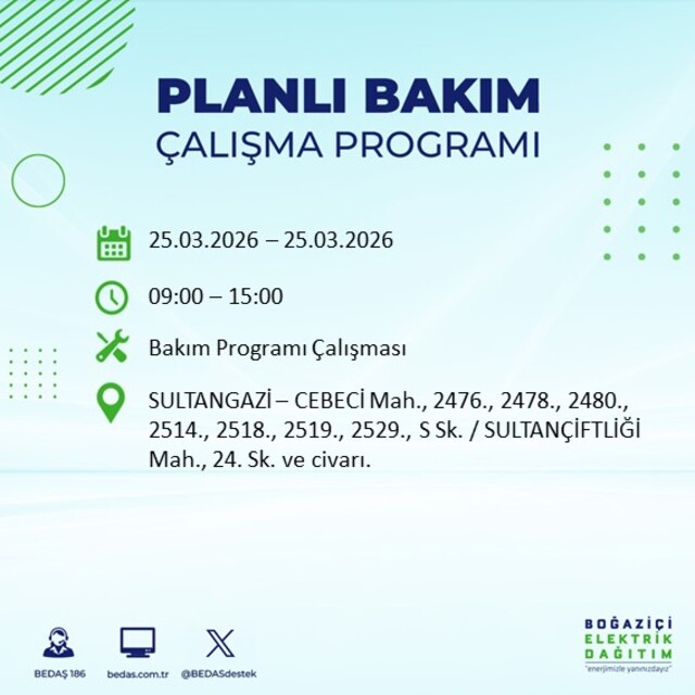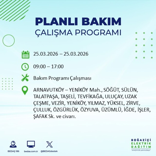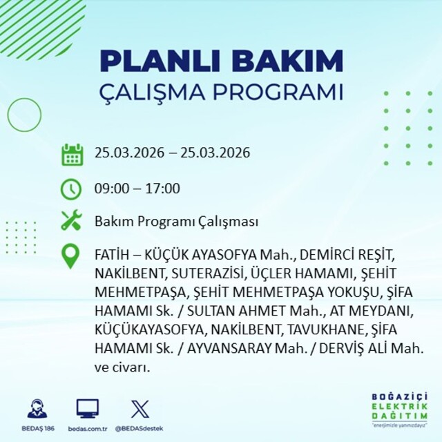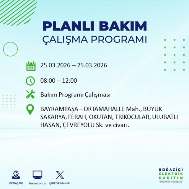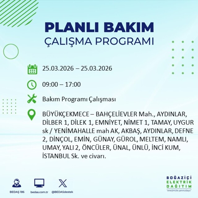 İstanbul’da planlı elektrik kesintilerine ilişkin duyuru BEDAŞ tarafından paylaşıldı. Zeytinburnu, Sultangazi, Silivri, Sarıyer, Küçükçekmece, Kağıthane, Güngören, Gaziosmanpaşa, Fatih, Eyüpsultan, Esenyurt, Esenler, Büyükçekmece, Beyoğlu, Beylikdüzü, Beşiktaş, Bayrampaşa, Bakırköy, Bahçelievler, Bağcılar ve Arnavutköy’de uygulanacak kesintilere ilişkin ayrıntılar netleşti. Peki, 25 Mart 2026 İstanbul'da elektrik kesintisi saat kaçta başlayıp bitecek?