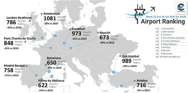 İstanbul Havalimanı, 12-18 Ekim haftasında Amsterdam'ın ardından Avrupa'da en çok uçuş yapılan 2. havalimanı oldu. Antalya Havalimanı da uçuş sayısında 2019'a oranla en az düşüşe imza atan havalimanı olarak öne çıktı