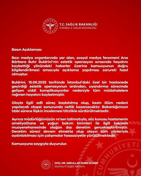 Açıklamada; "Bazı medya organlarında yer alan, sosyal medya fenomeni Ana Brbara Buhr Buldrini'nin estetik operasyon sırasında hayatını kaybettiği yönündeki haberler üzerine kamuoyunun doğru bilgilendirilmesi amacıyla açıklama yapılması zarureti hasıl olmuştur. Buldrini, 15 Haziran 2025 tarihinde İstanbul'daki özel bir hastanede geçirdiği estetik operasyonun ardından, uyandırma sürecinde gelişen ciddi komplikasyonlar nedeniyle tüm müdahalelere rağmen hayatını kaybetmiştir. Olayla ilgili adli süreç başlatılmış olup, kesin ölüm nedeni yapılacak otopsi sonucunda netlik kazanacaktır. Bakanlığımızın tıbbi sürece ilişkin incelemesi titizlikle sürdürülmektedir. Ayrıca müdürlüğümüzün re'sen talimatıyla, söz konusu hastanenin ameliyathane ve yoğun bakım birimleri ile ilgili hekimin muayenehanesinde olağan dışı denetim gerçekleştirilmiştir. Denetim süreci devam etmekte olup olayın tüm yönleriyle aydınlatılması için çalışmalar hassasiyetle yürütülmektedir" ifadelerine yer verildi.
