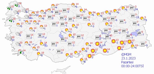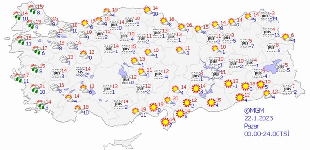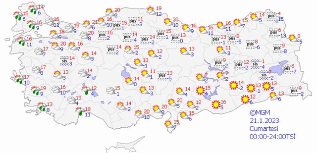 Meteoroloji Genel Müdürlüğü tarafından yapılan son değerlendirmelere göre: ülkemizin kuzey ve batı kesimlerinin parçalı ve yer yer çok bulutlu, Marmara, Ege (Afyonkarahisar hariç), Burdur'un doğusu ile Isparta ve Antalya çevrelerinin yerel olmak üzere aralıklı sağanak yağışlı, diğer yerlerin az bulutlu ve açık geçeceği tahmin ediliyor.