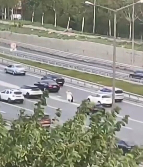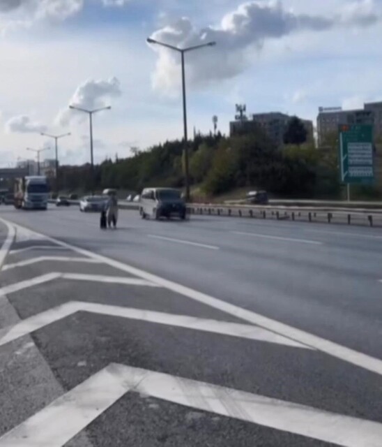 Görüntülerde sürücünün, "Otobanda yolun ortasında yürüyor. Az kalsın çarpıyorduk. Abla kenara çekil" sözleri duyuluyor.