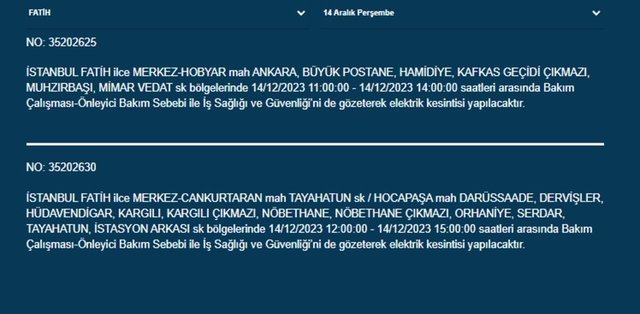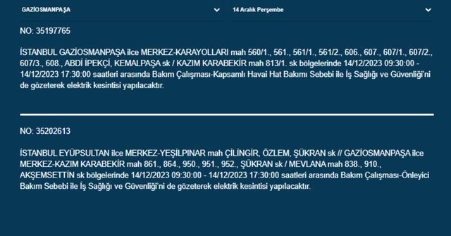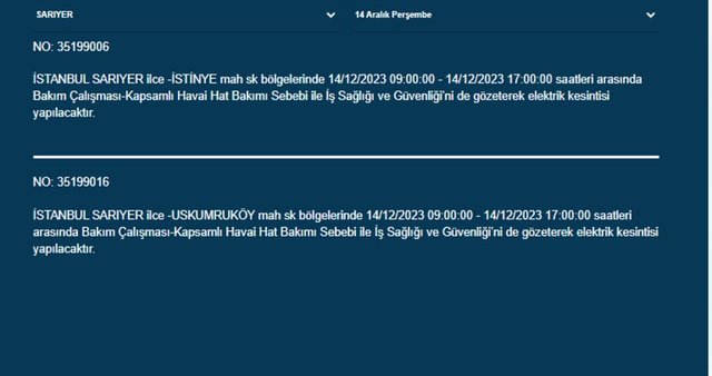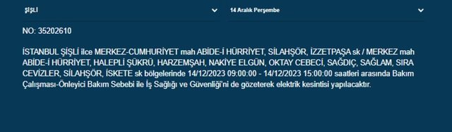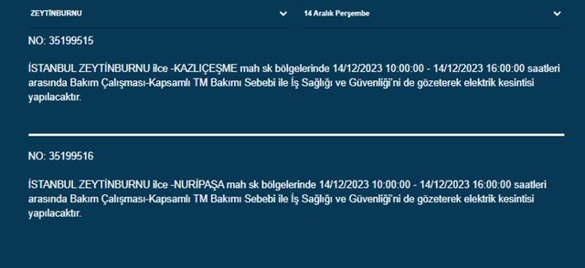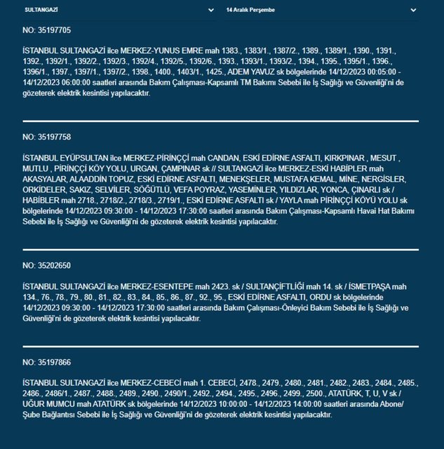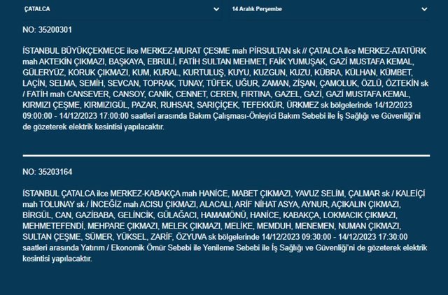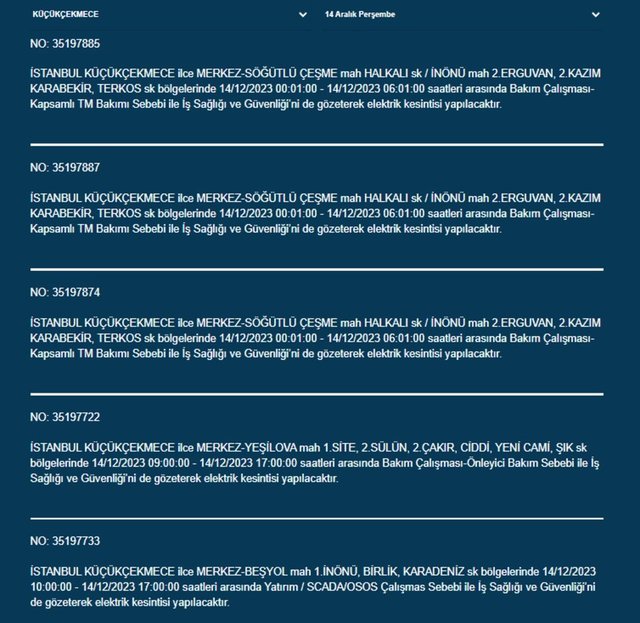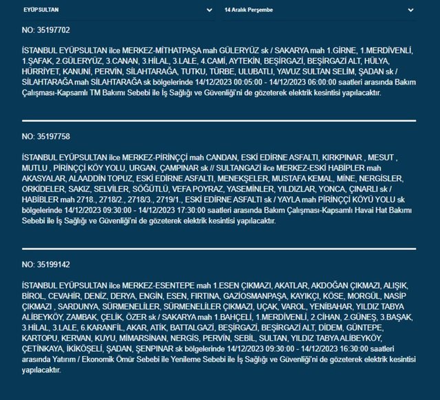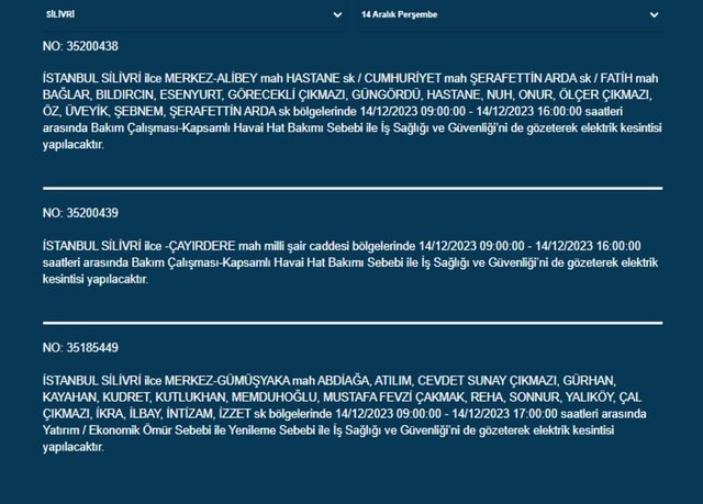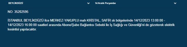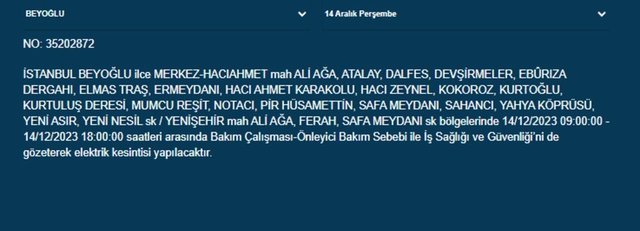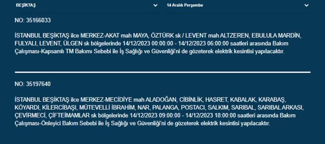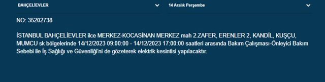 14 ARALIK BEDAŞ ELEKTRİK KESİNTİSİ OLACAK İLÇELER