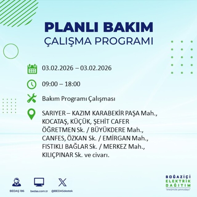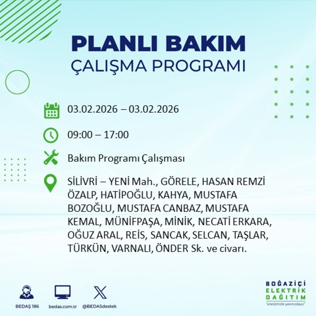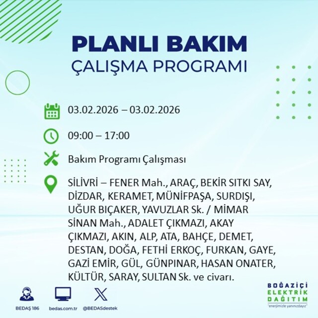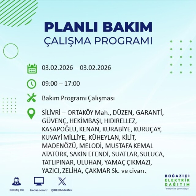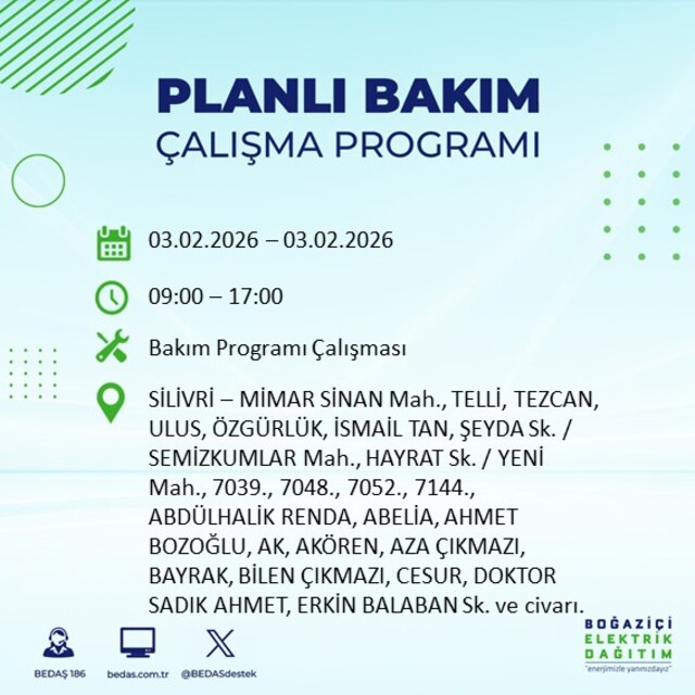 Boğaziçi Elektrik Dağıtım A.Ş (BEDAŞ) İstanbul'da 3 Şubat Salı günü birçok ilçede elektrik kesintisi yaşanacağını açıkladı. Kesinti yaşanacak ilçeler ve mahalle bilgileri de paylaşıldı. Bilindiği gibi, İstanbul Avrupa Yakası elektrik kesintisi duyuruları BEDAŞ tarafından günlük olarak yayınlanıyor. İşte İstanbul'da elektrik kesintisi yaşanacak ilçeler...