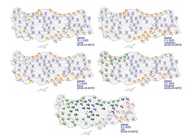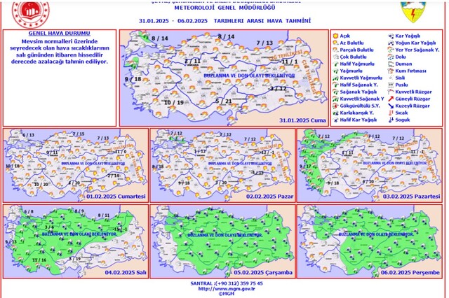 Meteoroloji Genel Müdürlüğü tarafından yapılan tahminlere göre: Ülkemizin batı kesimlerinin yer yer çok bulutlu, Çanakkale'nin doğu ilçeleri, Balıkesir'in batı kesimleri ile Kırklareli ve İstanbul'un kuzey kesimlerinin aralıklı sağanak yağışlı, diğer yerlerin parçalı ve az bulutlu geçeceği tahmin ediliyor. İç ve doğu kesimlerde buzlanma ve don ile birlikte Marmara ile iç ve doğu kesimlerde pus ve yer yer sis bekleniyor. Doğu Karadeniz’in iç kesimlerinin yüksekleri ile Doğu Anadolu’nun yüksek ve dik yamaçlarında çığ tehlikesi bulunmaktadır.