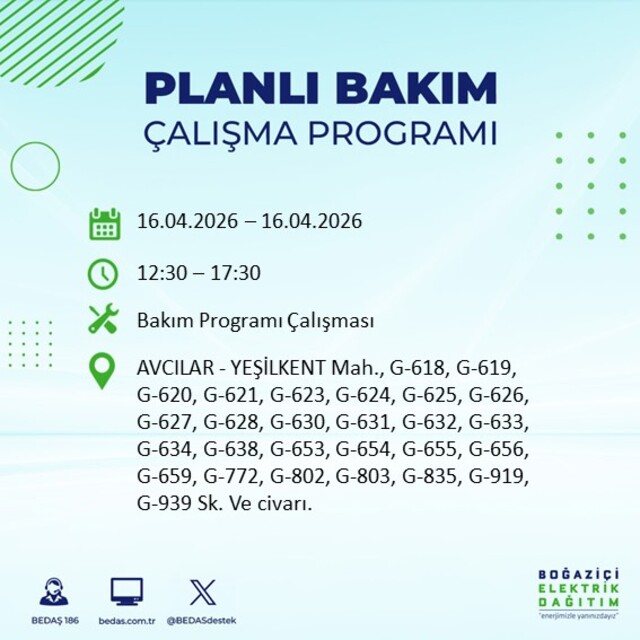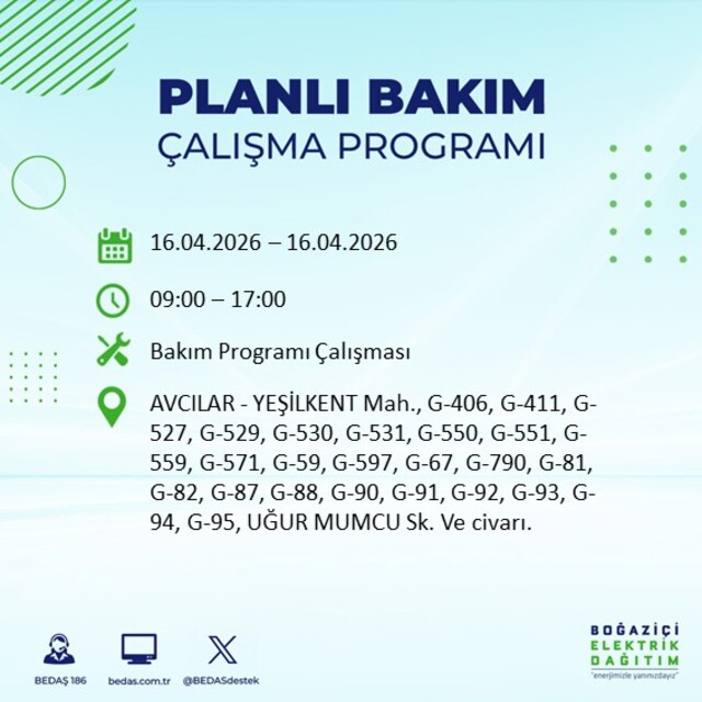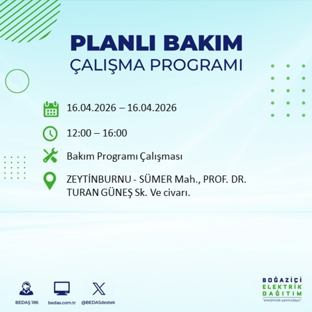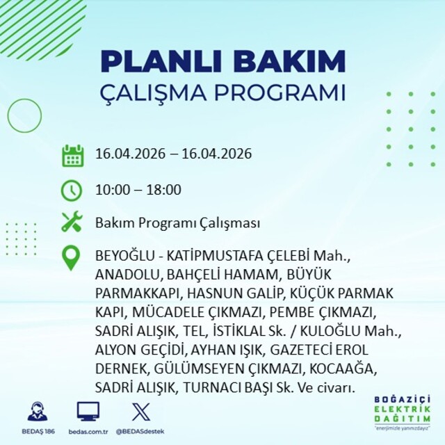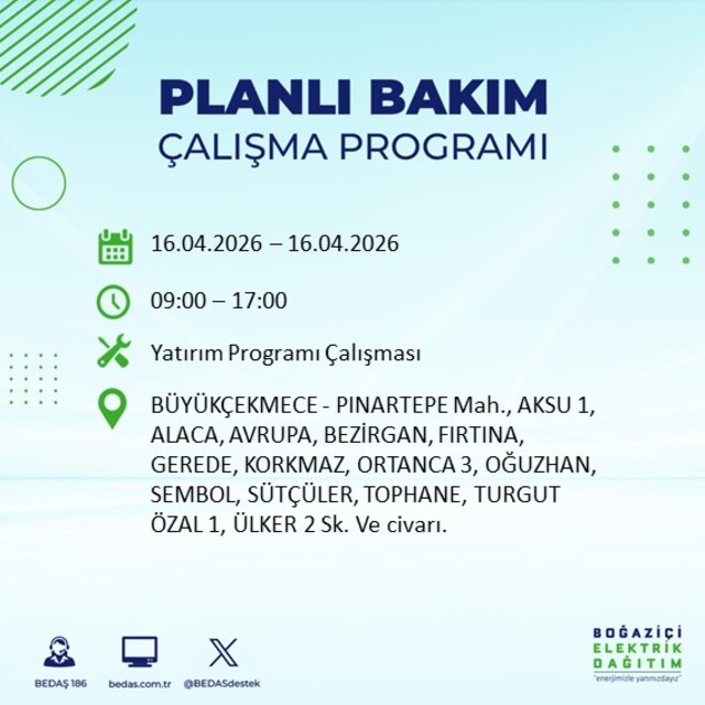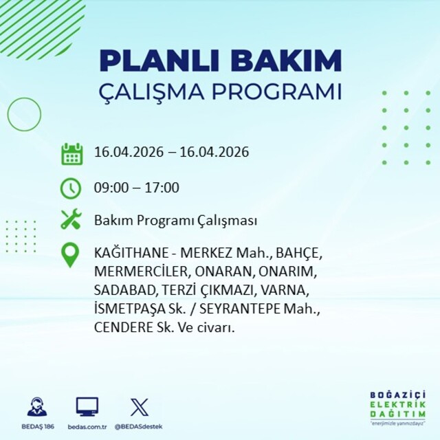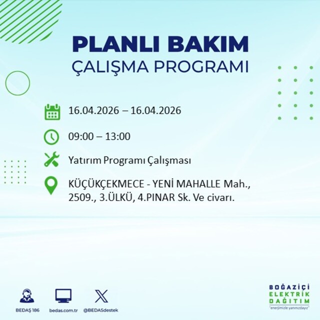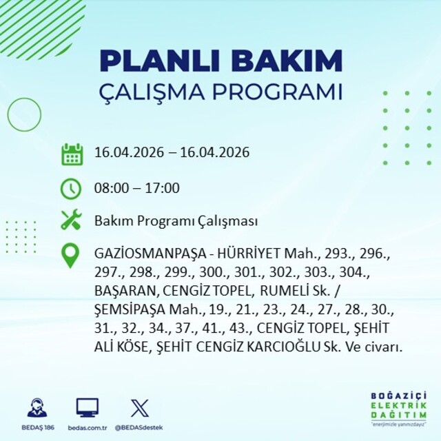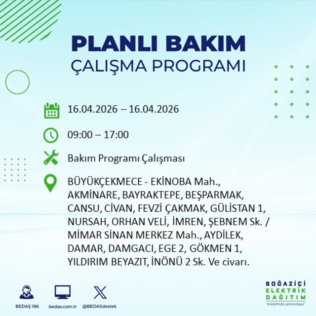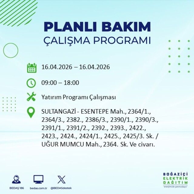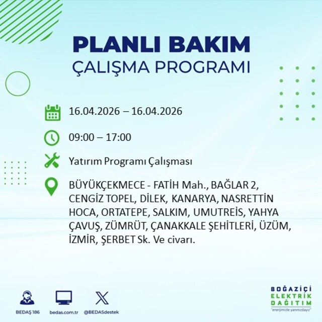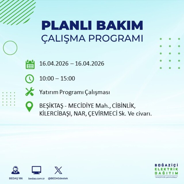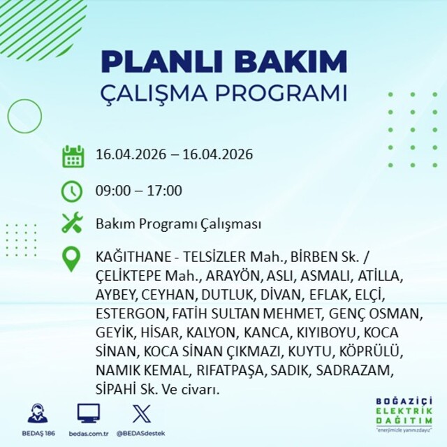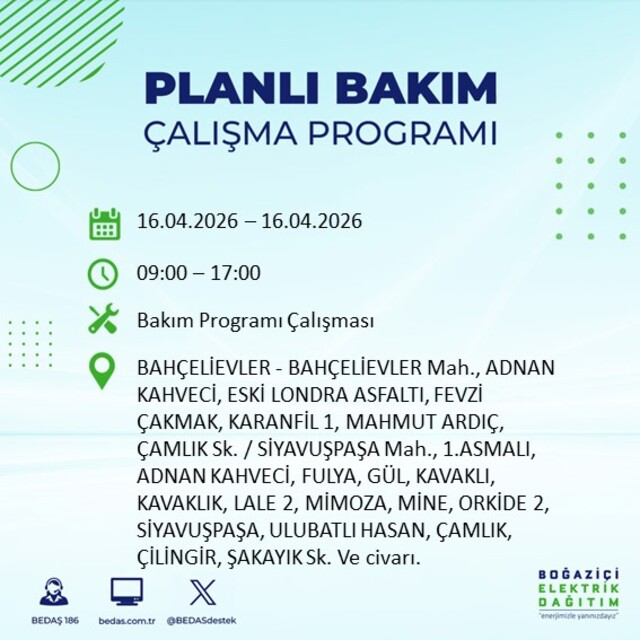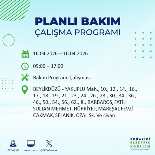 Boğaziçi Elektrik Dağıtım A.Ş tarafından yapılan açıklamaya göre, 16 Nisan Perşembe günü İstanbul'da farklı saat aralıklarında büyük çaplı elektrik kesintileri uygulanacak. İşte elektrik kesintisi yaşanacak ilçeler ve mahaller listesi: