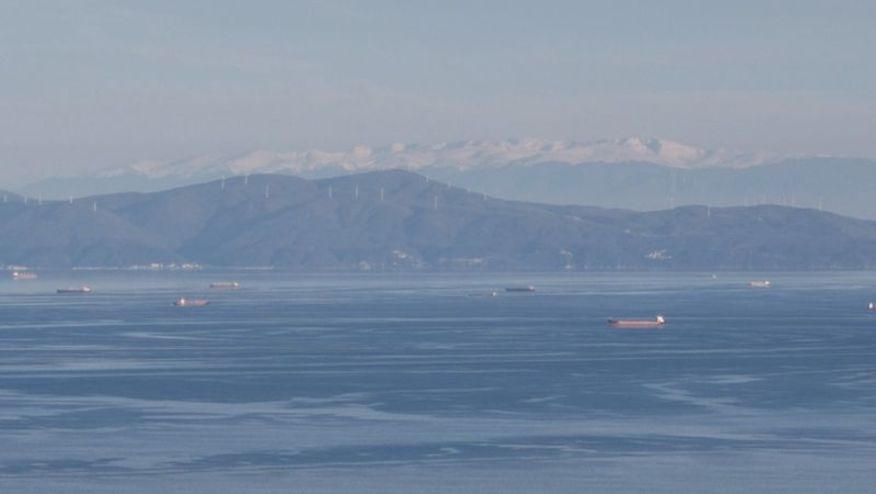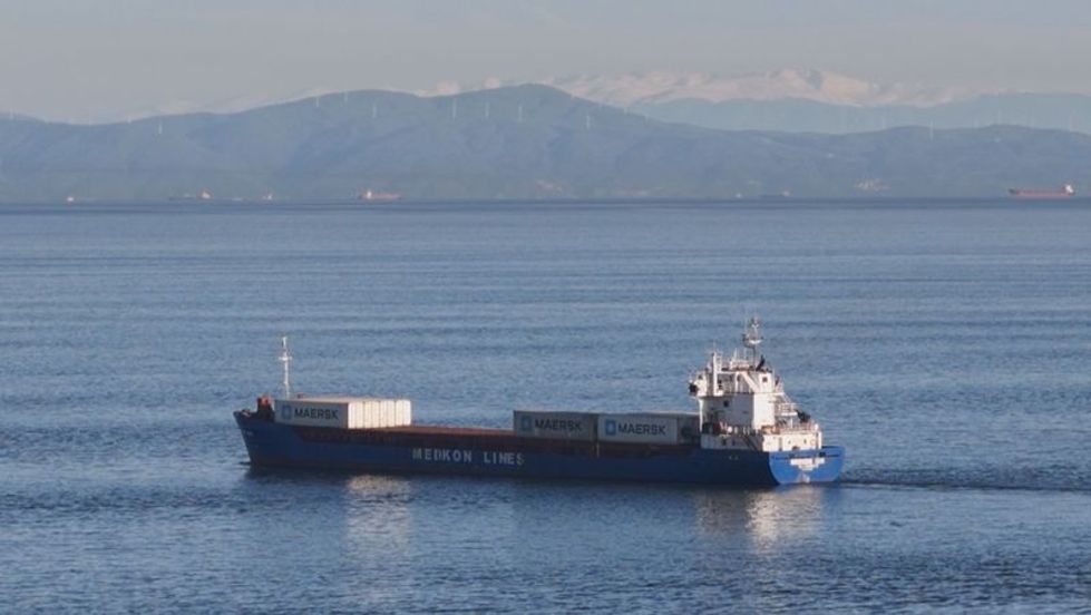 Marmara Denizi üzerinden kaydedilen görüntülerde, deniz trafiğiyle birlikte arka planda yükselen karlarla kaplı Uludağ dikkat çekti.