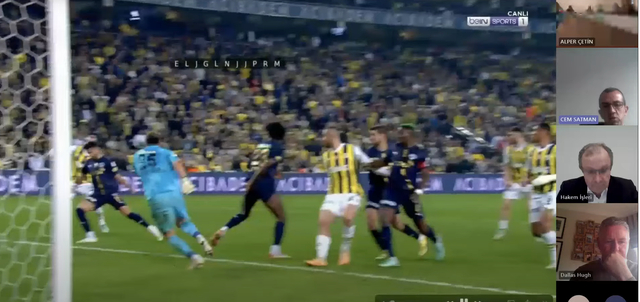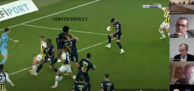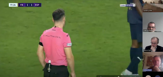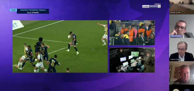Hugh Dallas: VAR odasında gördüğünle burada gördüğün farklı değil. Amaç objektiflik. Orada da burada da gördüğün aynı. O yüzden net olmalı. Erkan'ın 'Aa penaltı olabilir mi' diye endişe etmesini anlıyorum ama bu görüntüyle beraber topun elle oynama olduğuna dair bir kanıt yoksa hakemi de çağırmıyoruz. Çünkü elimizde bir kanıt yok. Sahada doğal olarak senin açın görmeye mümkün değildi. Monitöre gittiğinde hangi görüntünün elle oynama olduğuna kanaat getirdin Cihancım.