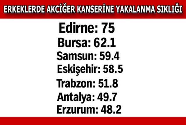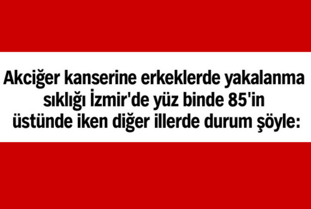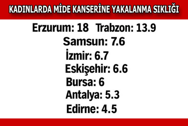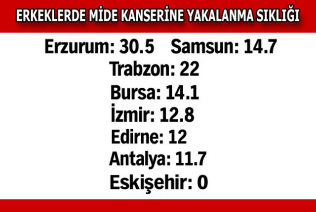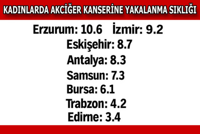 İzmir Halk Sağlığı Kanser Şube Müdürü Doç. Dr. Sultan Eser, Türkiye'nin bazı bölgelerindeki kanser türlerinin değişkenlik gösterdiğini, sigara bağımlılığının yüksek olduğu İzmir'de akciğer kanserine, tuzlanmış ya da tütsülenmiş balık tüketiminin çok olduğu Trabzon'da mide kanserlerine sıklıkla rastlandığını açıkladı.
