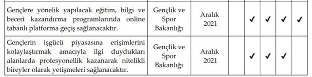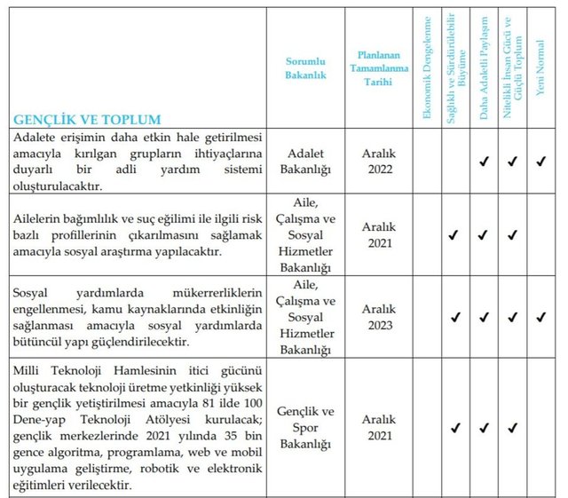 YEP'in gençlik ve toplum kısmında ise, adalet, aile, sosyal yardım ve teknoloji üretme konuları çne çıkıyor.