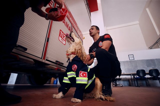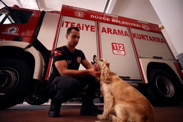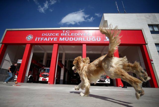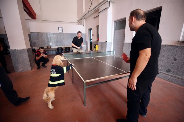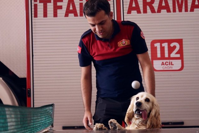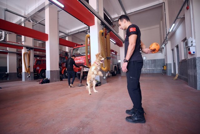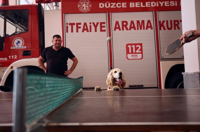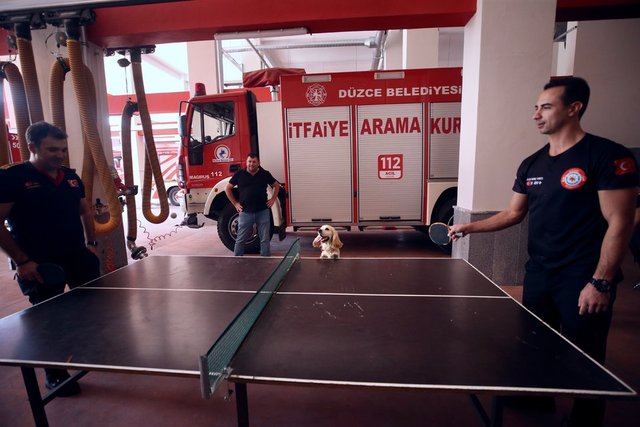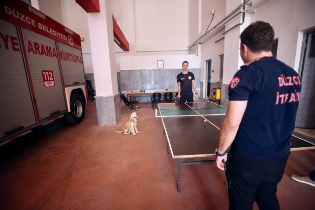 Masa tenisi ve futbol oynayan personelin yanından ayrılmayan, molalarda itfaiyecilerin kucaklarına yatarak dinlenen Ateş'e arama kurtarma faaliyetlerinde yer alması için eğitim veriliyor.