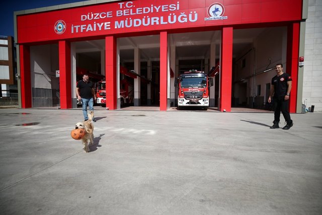 Düzce'de itfaiye ekiplerince sahiplenilen köpek adeta maskotu haline geldiği personelin yanından bir an olsun ayrılmıyor
