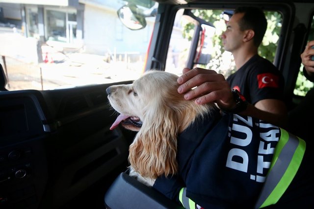 İtfaiyecilerin sahiplendiği köpek personelin yanından ayrılmıyor
