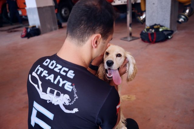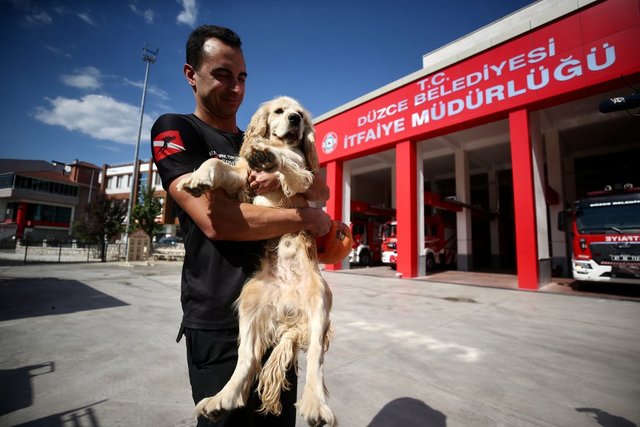Düzce Belediyesi İtfaiye Müdürlüğü personeli, Düzce Arama Kurtarma Derneği ekibinin yaklaşık 9 ay önce doğum yapan cocker cinsi köpeğinin bir yavrusunu sahiplendi.
