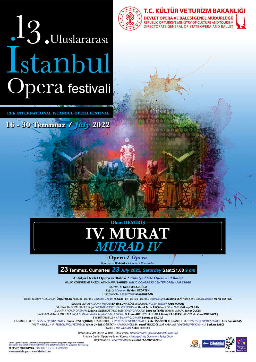 Dünyadaki ilk kez denize karşı düzenlenen opera festivali olma özelliğini taşıyan 13. Uluslararası İstanbul Opera Festivali’nde Antalya DOB’nin dev kadrosu; tarihin en görkemli seferlerinden birini gerçekleştiren Sultan IV. Murat’ın hayatını ele alan IV. Murat Operası’nı sergileyecek.