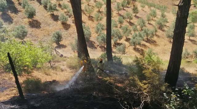 Olay yerine ulaşan ekipler, çam ağaçlarının bulunduğu bölgede etkili olan alevleri kontrol altına almaya çalışıyor.
