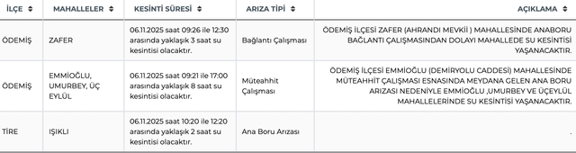 Ödemiş: Zafer, Emmioglu, Umurbey (06.11.2025, 09:26-12:30) - Ana Boru Arızası ve Bağlantı Çalışması