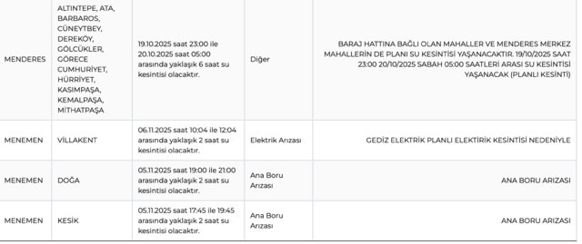 Menemen: Villakent, Doğa, Kesik (06.11.2025, 10:04-12:04) - Elektrik Arızası ve Ana Boru Arızası