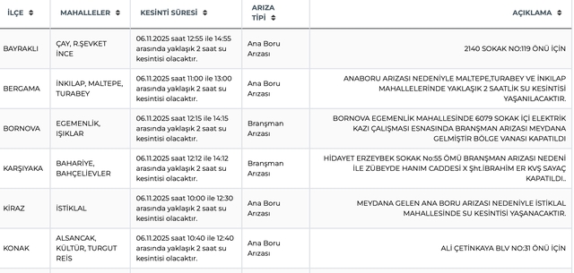 6 KASIM 2025 İZMİR'DE SU KESİNTİSİ OLAN İLÇELER!