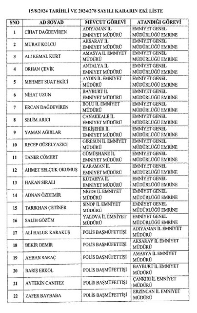 Asayiş Daire Başkanı Tolga Yılmaz, Eskişehir Emniyet Müdürlüğüne; Narkotik Suçlarla Mücadele Başkanı Ahmet Metin Turanlı, Tekirdağ Emniyet Müdürlüğüne; Siber Suçlarla Mücadele Daire Başkanı Faruk Aydın, Tokat Emniyet Müdürlüğüne; Tokat Emniyet Müdürü Armağan Adnan Erdoğan, Aydın Emniyet Müdürlüğüne; Şırnak Emniyet Müdürü Cemal Dalman, Bolu Emniyet Müdürlüğüne; Kilis Emniyet Müdürü Ahmet Kurt, Burdur Emniyet Müdürlüğüne; Erzincan Emniyet Müdürü Kenan Kurt, Çanakkale Emniyet Müdürlüğüne; Çankırı Emniyet Müdürü Yılmaz Delen, Niğde Emniyet Müdürlüğüne; Burdur Emniyet Müdürü Ümit Bitirik, Yalova Emniyet Müdürlüğüne; Polis Başmüfettişi Ali Haluk Karakuş, Adıyaman Emniyet Müdürlüğüne; Polis Başmüfettişi Bekir Demir, Aksaray Emniyet Müdürlüğüne; Polis Başmüfettişi Ayhan Saraç, Amasya Emniyet Müdürlüğüne; Polis Başmüfettişi Barış Erkol, Bayburt Emniyet Müdürlüğüne; Polis Başmüfettişi Aytekin Canıtez, Çankırı Emniyet Müdürlüğüne; Polis Başmüfettişi Zafer Baybaba, Erzincan Emniyet Müdürlüğüne; Polis Başmüfettişi Tacettin Çelebi, Giresun Emniyet Müdürlüğüne; Polis Başmüfettişi İsmail Karasakal, Gümüşhane Emniyet Müdürlüğüne; Polis Başmüfettişi Mehmet Turhan, Karaman Emniyet Müdürlüğüne; Polis Başmüfettişi Aykut Korkmaz, Kilis Emniyet Müdürlüğüne; Polis Başmüfettişi Osman Elbir, Kütahya Emniyet Müdürlüğüne; Polis Başmüfettişi Serdar Büyükleblebici, Şırnak Emniyet Müdürlüğüne; Merkez Emniyet Müdürü Sibel Kılıçoğlu, Sinop Emniyet Müdürlüğüne; İçişleri Müşaviri İlker Arslan, Antalya Emniyet Müdürlüğüne getirildi.
