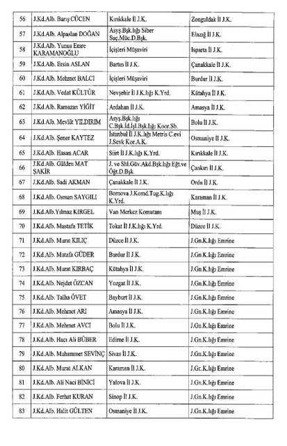 Ayrıca İzmir, Kahramanmaraş, Bursa, Manisa, Muğla, Mardin, Siirt, Bitlis, Erzurum, Şırnak, Tunceli, Ağrı, Trabzon, Nevşehir, Batman, Ardahan, Bayburt, Bartın, Sinop, Yalova, Yozgat, Edirne, Kırşehir, Malatya, Kars, Sivas, Zonguldak, Elazığ, Isparta, Çanakkale, Burdur, Kütahya, Amasya, Bolu, Osmaniye, Kırıkkale, Çankırı, Ordu, Karaman, Muş ve Düzce olmak üzere 41 ilin jandarma komutanı değişti.