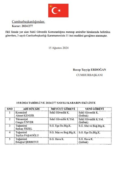 Kararnameyle Sahil Güvenlik Komutanı Koramiral Ahmet Kendir ile Sahil Güvenlik Komutan Yardımcısı Tümamiral Cengiz Ünver'in mevcut görevlerine devamına karar verilirken, Sahil Güvenlik Ege Deniz Bölge Komutanı Tuğamiral Serkan Tezel, Sahil Güvenlik Marmara ve Boğazlar Bölge Komutanlığına; Sahil Güvenlik Marmara ve Boğazlar Bölge Komutanı Tuğamiral Tayfun Paşaoğlu, Sahil Güvenlik Ege Deniz Bölge Komutanlığına atandı.