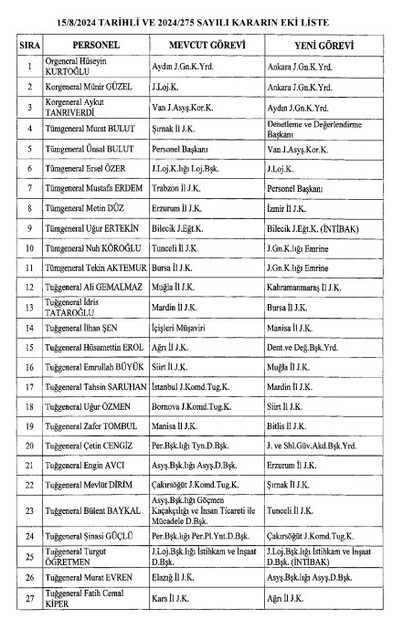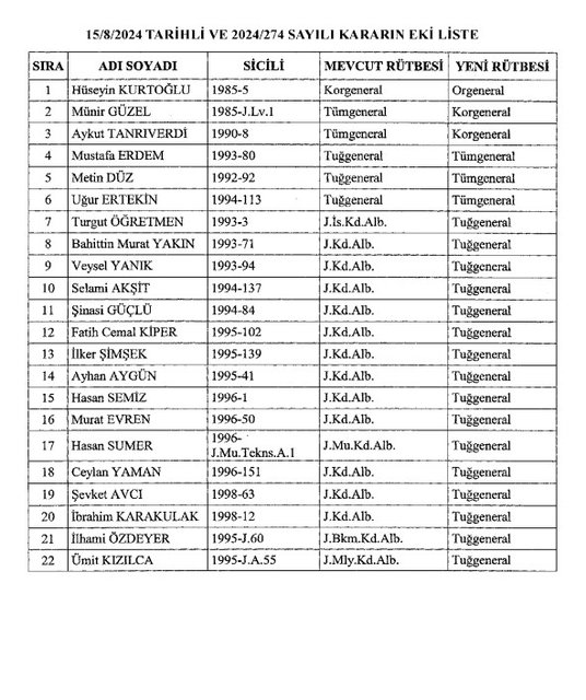 Kararnameyle Jandarma Genel Komutanlığında 30 Ağustos'tan geçerli olmak üzere 6 general bir üst rütbeye, 16 albay ise generalliğe yükseldi.