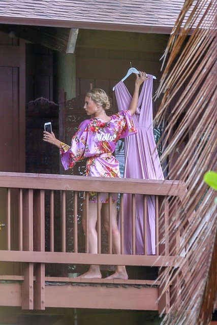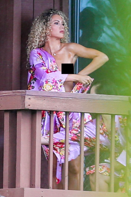 Parrish'in nedimelerinden oyuncu Lindsay Anne Taylor, balkonda bornozunu düzeltirken kendilerini uzaktan görüntüleyen paparazzilere yakalandı.