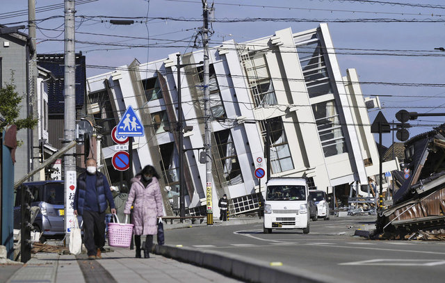 Devlet televizyonu NHK'ya ait görüntüde, Wajima'da 7 katlı bir binanın yan yattığı görüldü. İşikawa Eyalet Valiliği, bölgedeki depremler sonrası 24 kişinin hayatını kaybettiğini açıkladı.
