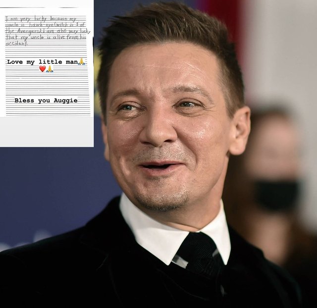 Sosyal medya hesabından sağlık durumu hakkında sık sık bilgi veren Jeremy Renner, geçirdiği kazadan sonra yeğeninin kendisine yazdı notu "Küçük adamımı seviyorum... Çok yaşa Auggie" sözleriyle yayınladı.