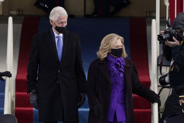 Eski First Lady Hillary Clinton da morun ağırlıkta olduğu bir görünüm oluşturdu. Clinton, bordo kabanını Ralph Lauren imzalı mor takımıyla tamamladı.