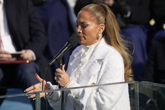 Biden'ın yemin töreninde sahne alan Jennifer Lopez, This Land Is Your Land ve America the Beautiful adlı şarkıları seslendirdi... Lopez de Michelle Obama gibi görünümünde tek renk kullandı...