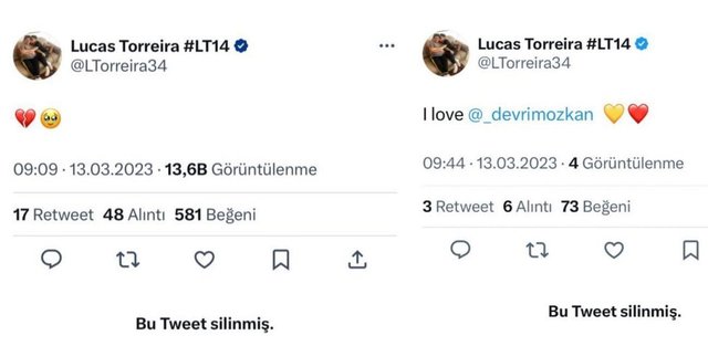 Devrim Özkan'ın bu açıklamasının ardından, Galatasaraylı futbolcu Lucas Torreira'nın sosyal medya hesabından 13 Mart 09:09'da kırık kalp ve ağlayan surat emojilerinin bulunduğu bir tweet paylaşılmıştı. Torreira'nın hesabından 09:44'te de 'Seni seviyorum' ifadeleri kullanılmıştı. Bu tweetler kısa süre içinde silinmişti.