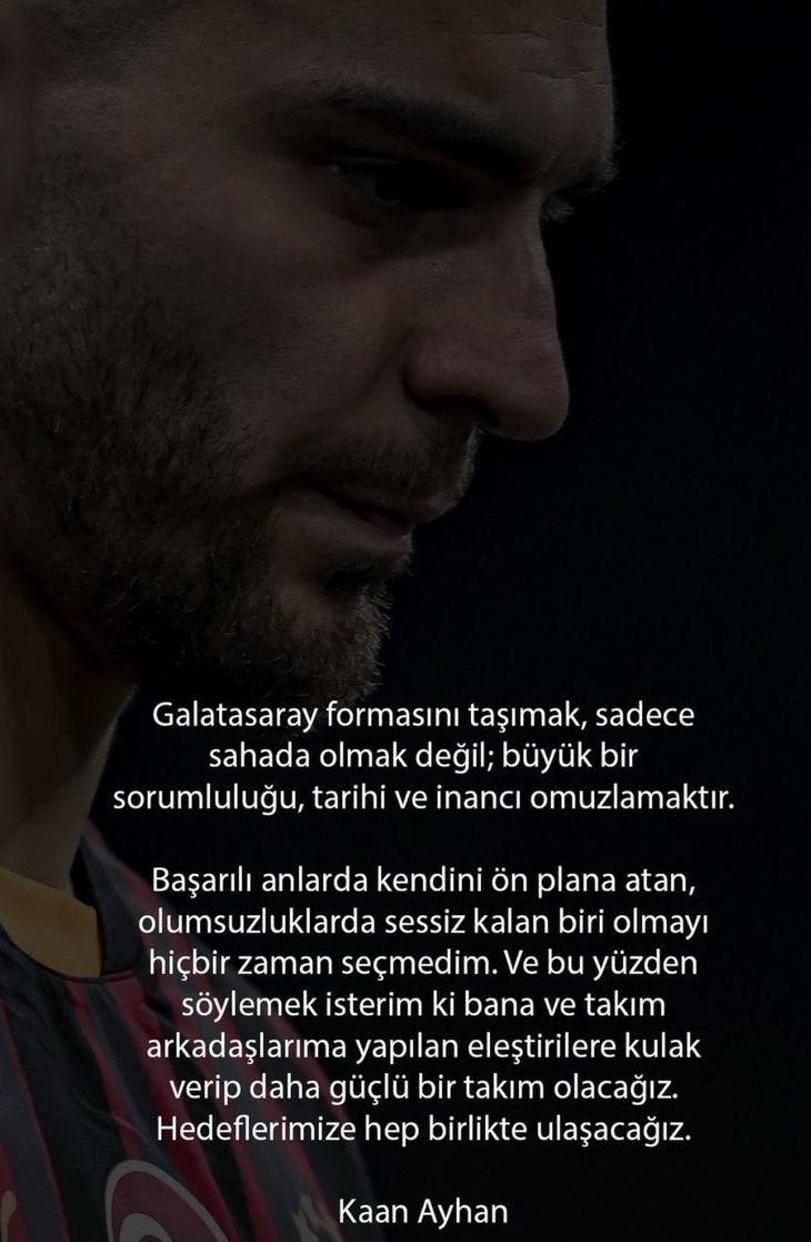 "Galatasaray formasını taşımak, sadece sahada olmak değil; büyük bir sorumluluğu, tarihi ve inancı omuzlamaktır. Başarılı anlarda kendini ön plana atan, olumsuzluklarda sessiz kalan biri olmayı hiçbir zaman seçmedim. Ve bu yüzden söylemek isterim ki bana ve takım arkadaşlarıma yapılan eleştirilere kulak verip daha güçlü bir takım olacağız. Hedeflerimize hep birlikte ulaşacağız."
