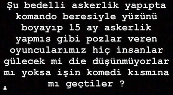 Şu bedelli askerlik yapıp da komanda beresiyle yüzünü boyayıp, 15 ay askerlik yapmış gibi pozlar veren oyuncularımız; 'Hiç insanlar gülecek mi?' diye düşünmüyorlar mı? Yoksa işin komedi kısmına mı geçtiler?