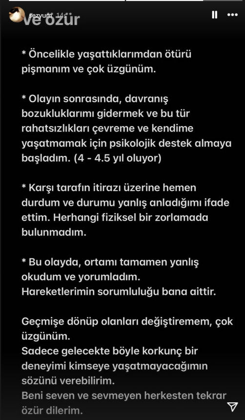 Kaan Sezyum; "Öncelikle yaşattıklarımdan ötürü pişmanım ve çok üzgünüm" derken, davranış bozuklukları için psikolojik destek aldığını açıkladı.