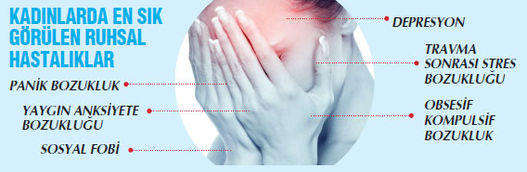 Yine ABD’deki istatistiklerde kadınlarda izlenen ruhsal hastalık oranının yüzde 22, erkeklerde ise yüzde 14.6 olduğu görülüyor. Depresif bozukluklar ile anksiyete bozuklukları gibi psikolojik ve çevresel faktörlerin daha fazla tetiklediği ruhsal hastalıklar kadınlarda erkeklerden iki kat fazla görülüyor. Farklı çalışmalarda, depresif bozukluklarda bu oran 1.5 - 3 kata çıkarken; panik bozukluk, yaygın anksiyete bozukluğu, travma sonrası stres bozukluğu, obsesif kompulsif bozukluk gibi anksiyete bozukluklarında oranın erkeklerden 1.5 - 4 kat daha fazla olduğuna dikkat çekiliyor.