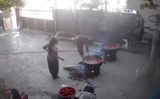 Patlama ile kazan devrilirken, kadınlar büyük şaşkınlık yaşadı.