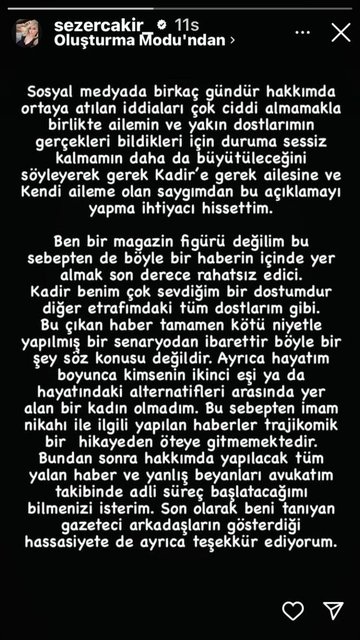 Sosyal medyada birkaç gündür hakkımda ortaya atılan iddiaları çok ciddiye almamakla birlikte ailemin ve yakın dostlarımın gerçekleri bildikleri için duruma sessiz kalmamın daha da büyütüleceğini söyleyerek, gerek Kadir'e, gerek ailesine ve kendi aileme olan saygımdan bu açıklamayı yapma ihtiyacı hissettim.